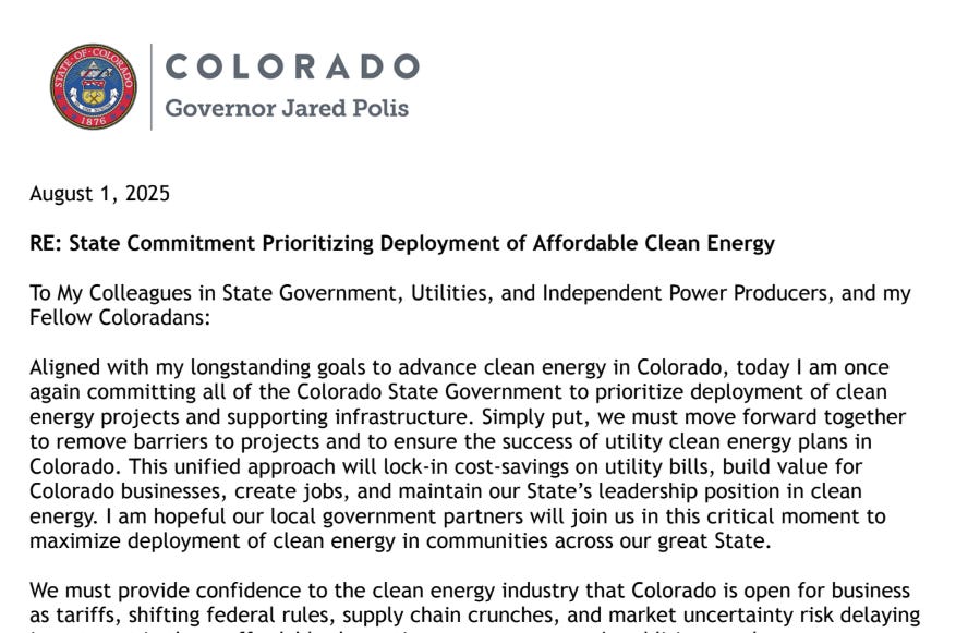 In August 2025, Governor Jared Polis of Colorado instructed all state agencies to work to get new solar, wind, battery, and power line projects online “as quickly as possible” and to eliminate tangled administrative, interconnection, and permitting bottlenecks to pursue “maximal clean energy.”