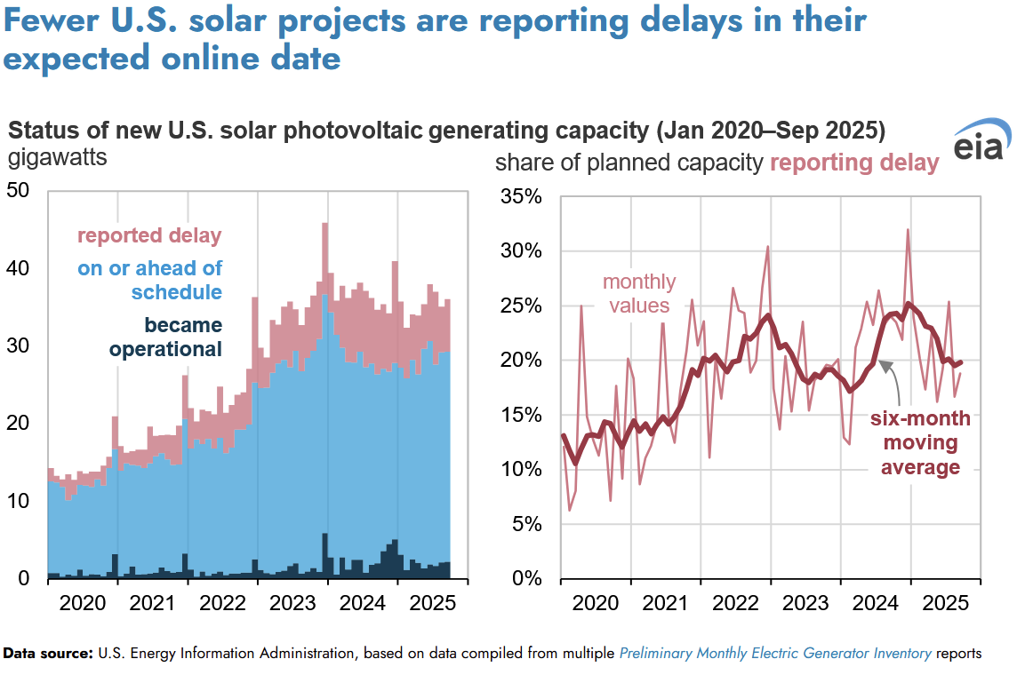 And there are some encouraging signs that such state-level pro-clean energy permitting reform efforts are beginning to have an impact! The U.S. Energy Information Administration recently reported that the fraction of upcoming (i.e. surviving) U.S. solar projects reporting delays has declined slightly, from solar projects accounting for 25% of planned U.S. capacity reporting delays in the third quarter of 2024 down to solar projects accounting for 20% of planned U.S. capacity reporting delays in Q3 2025.