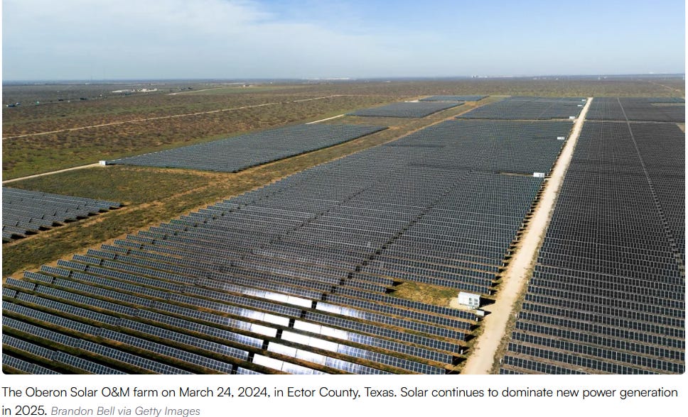 There’s a strange double-vision required to comprehend the situation here. The U.S. is massively self-harming for painfully stupid ideological reasons and wildly under-performing on solar compared to what it could and should be building. Bad! But what’s left *still* counts as the best year for solar in U.S. history. Essentially, the surviving minority of solar projects that the White House couldn’t cancel are providing 75% of all new power from all sources built in America in 2025 and adding up to make 2025 on track to be a record-high year of American solar installations!