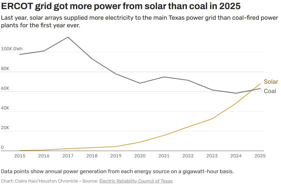 In 2025, for the first year ever, solar supplied more electricity than coal to the ERCOT grid of Texas! It’s grown incredibly fast. In 2017, solar provided 2,258 gigawatt-hours (GWh) of ERCOT power compared to coal’s 115,141 GWh, but in 2025, solar provided 67,800 GWh and coal just 63,031 GWh. Solar plus wind provided 37% of ERCOT’s power that year. In addition to reducing air pollution, the great Texas solar, wind, and battery boom is credited with stabilizing the grid and preventing blackouts.