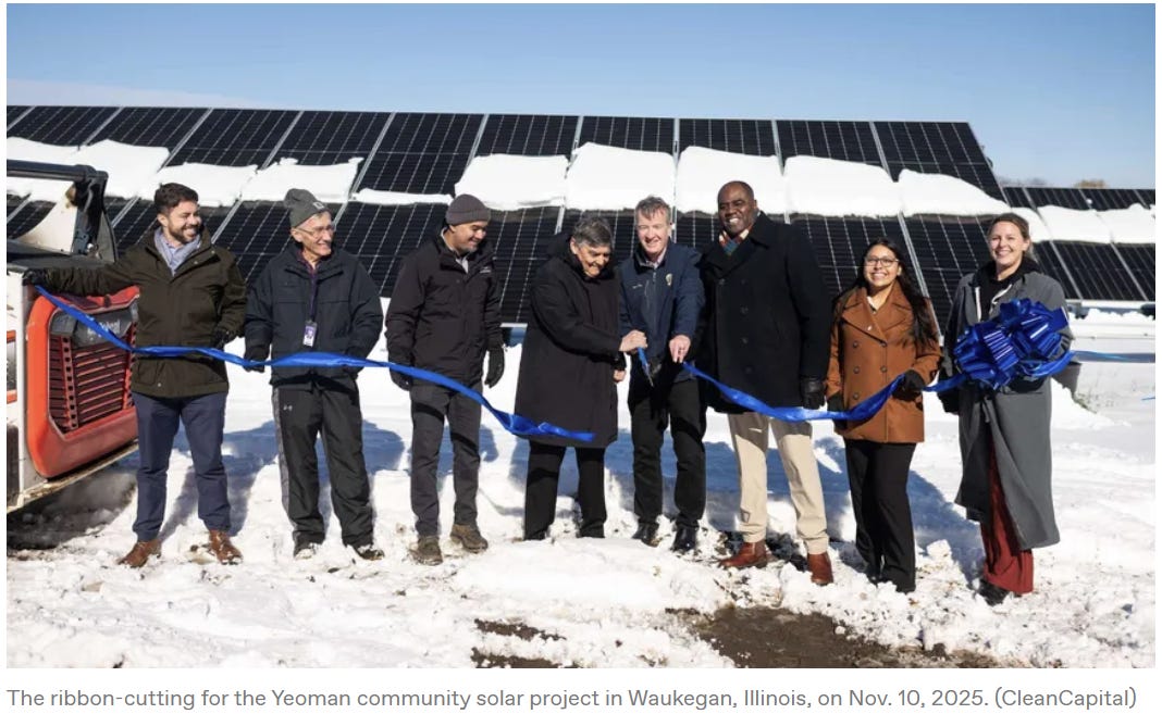 And in Illinois, a community solar project in Waukegan has built the 9.1 MW Yeoman array on a former landfill Superfund site too polluted for other uses. Subscribing residents are guaranteed to see savings on their energy bills.