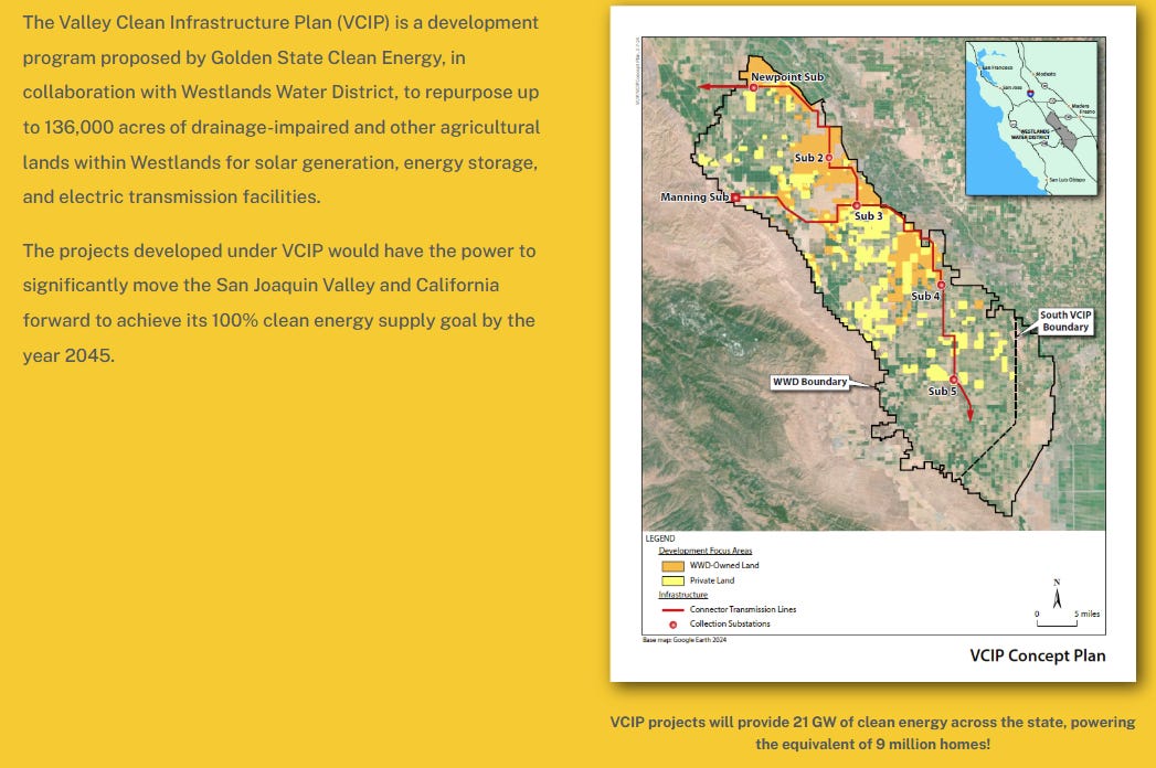 In the Central Valley of California, the Westlands Water District just approved plans for a truly massive new project: 21 GW (21,000 MW) of solar capacity plus roughly equivalent battery storage to be built across 600,000 acres. If all goes well, it could supply one-quarter of California’s electricity needs by 2035! (It will also help growers survive chaotic weather by directly reducing irrigation needs). This would be by far the biggest solar and battery project yet built in the United States. Finally, a true U.S. landscape-scale solar buildout on the scale of what China and India are doing!