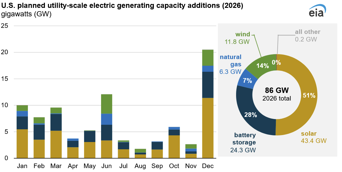 The Energy Information Administration projects that the United States will build a record-high 86 GW of new power capacity from all sources in 2026, including 43.4 GW of solar (51% of the total), 24.3 GW of battery storage (28%) and 11.8 GW of wind (14%). That’s 93% renewables in new energy construction, and just 7% new fossil gas! In 2026, renewables are projected to provide 93% of all new-built electricity-generating capacity across America!